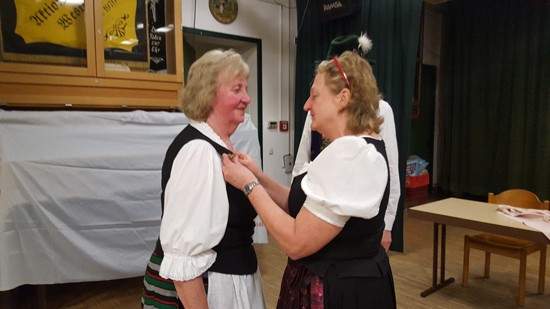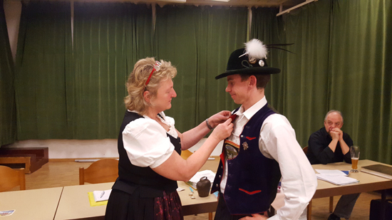 Danach wurde Gerti vom Vorstand gratuliert, das Geschenk überreicht und ihr für die jahrelange Treue dem Verein gegenüber gedankt. Die Gäste schlossen sich mit ihren Glückwünschen an. Für gute Stimmung sorgte die Mooshäusl Musik, die zu den Plattlern und Volkstänzen aufspielte. Das war aber nicht die einzige musikalische Darbietung an diesem Abend. Martin Gebhard erfreute seine Mutter und die Gäste mit Gertis Lieblingsliedern, die er auf der Gitarre begleitete. Und als Höhepunkt des Abends unterhielt der Opernsänger Richard Wiedl die Gäste mit einigen heiteren und professionell