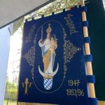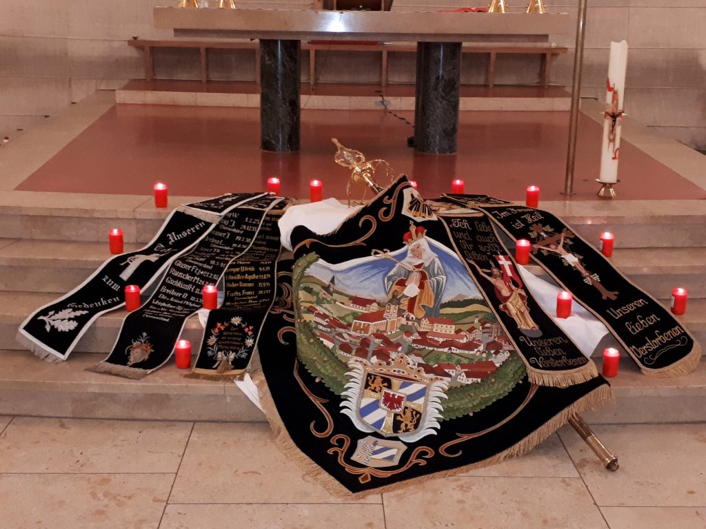 Die Vereinsfahne mit den Trauerbändern mit den Namen unserer verstorbenen Vereinsmitgliedern wurde auf die Stufen des Altares gelegt und Kerzen brannten für Sie zum Gedenken. So war die Bedeutung des Gottesdienstes für alle Kirchenbesucher klar. Denken an Alle die nicht mehr unter uns sind. Aber auch sich wieder sehen zu können, wenn auch nur unter der Maske sich ein Lächeln schenken und kurz austauschen: „ Wie geht’s dir denn“? Es tat einfach gut, wenn auch nur kurz Kontakt zu haben. Unser Vereinsgeistlicher Pater Davis zelebrierte in der Pfarrkirche St. Joachim einen sehr besinnlichen Gottesdienst und machte Mut durchzuhalten und auf eine bessere Zeit ohne Corona zu warten. Auch diese wird wieder kommen. Und darauf vertrauen dass wir unser 100jhähriges Gründungsfest im Oktober feiern können. Allen die am Gottesdienst teilgenommen haben sei ein herzliches Vergelt´s Gott gesagt, allen voran unserem Adi Kulhanek der den Gottesdienst organisierte.